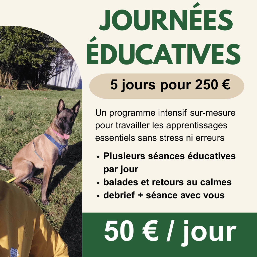 Prise en charge le matin directement chez vous ou en point de rendez-vous. Travail éducatif en plusieurs séances tout au long de la journée (rappel, marche en laisse, obéissance de base, sociabilisation, etc.). Moments de détente et de jeux pour garder un équilibre entre apprentissage et plaisir. Retour du chien le soir avec un compte-rendu et des conseils pour reproduire les exercices à la maison. Généralement sur une semaine intensive, avec au minimum un cours avec vous fin de dernière journée, pour avoir des résultats concrets et qui durent.